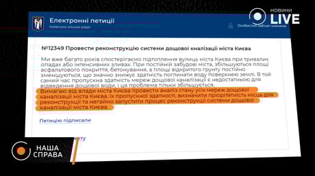 "Вимагаю від влади міста Києва провести аналіз стану всіх мереж дощової каналізації міста Києва, їхньої пропускної здатності, визначити пріоритетність місць для реконструкції та негайно запустити процес реконструкції системи дощової каналізації міста Києва", — йдеться в петиції.