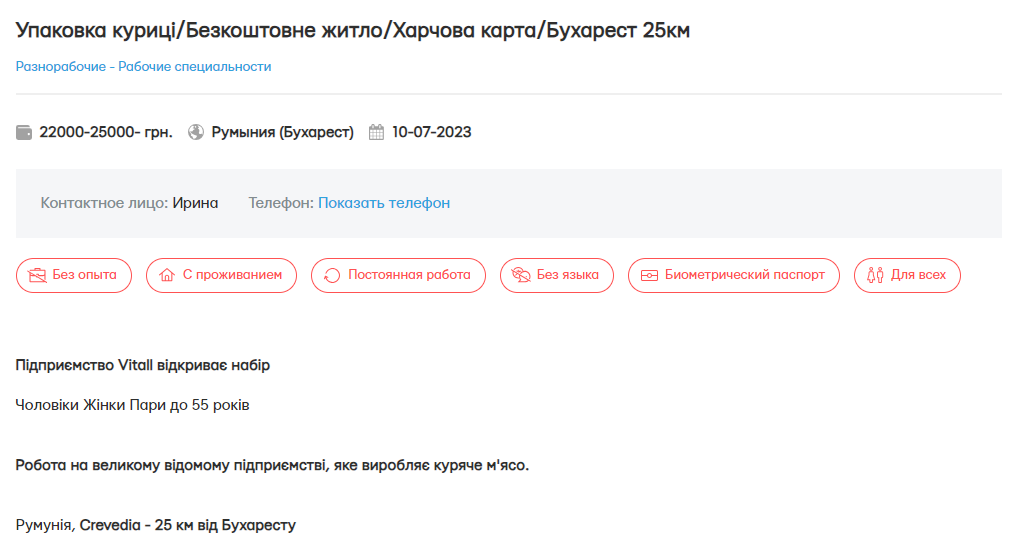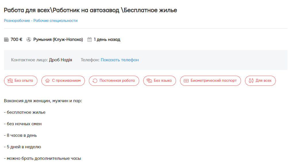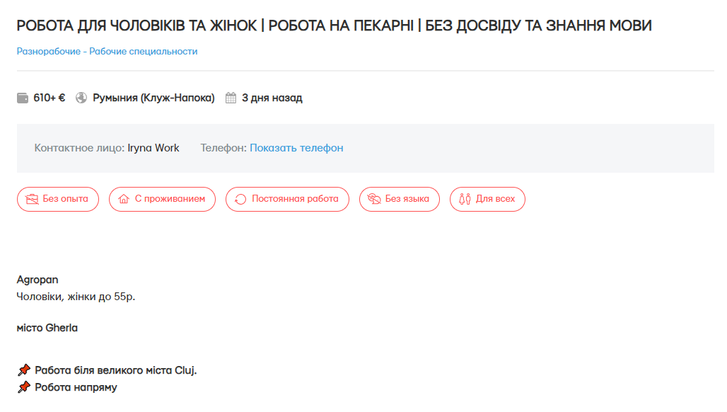 А у місті Креведія шукають чоловіків, жінок і сімейні пари до 55 років на роботу на великому підприємстві, яке виробляє куряче м'ясо. Робота переважно буде полягати в упаковці готової продукції в лотки, а також в обробці курки. Проживання за рахунок роботодавця, у кімнаті проживають по 3-4 особи.