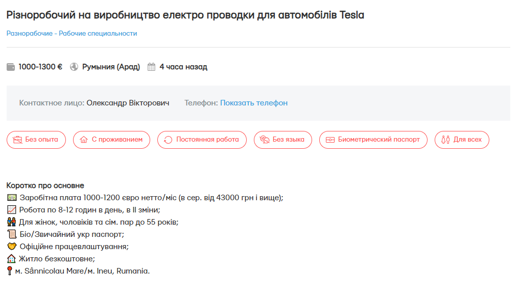 У країнах Європейського союзу, зокрема в Румунії, роботодавці здебільшого зацікавлені у залученні працівників з-за кордону до галузей, де не потрібно мати спеціальної кваліфікації. Так, у румунському місті Інеу шукають різноробочих на виробництво електропроводки для автомобілів Tesla. Роботодавець пропонує вакансію жінкам, чоловікам та сімейним парам до 55 років. Потрібно буде прокладати дроти різного кольору по схемі, обмотувати їх ізолентою і перевіряти готові кабелі.