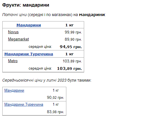 Середня ціна за 1 кг мандаринів у серпні становить 94,95 грн.