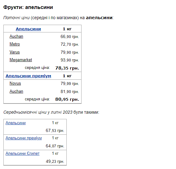 Середня ціна за 1 кг апельсинів у серпні становить 78,35 грн.