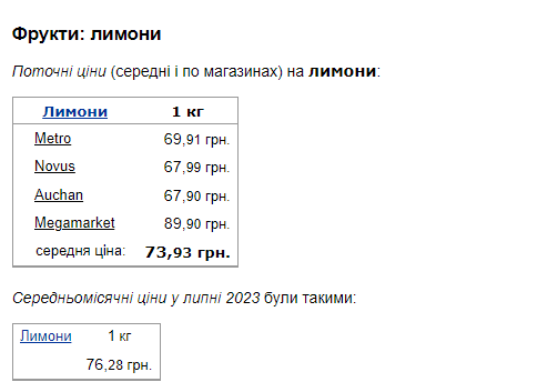 Середня ціна за 1 кг лимонів у липні становила 76,28 грн.
