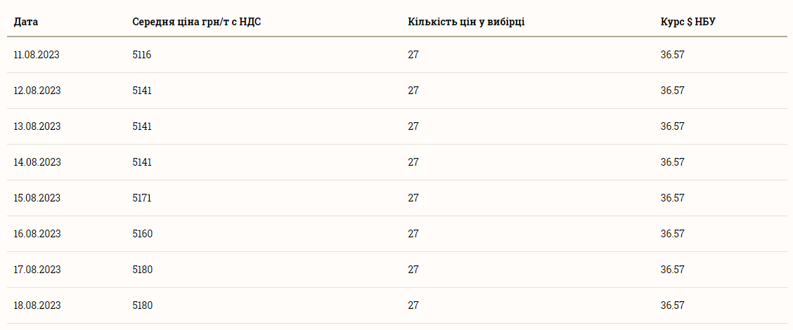 При цьому ціна на кукурудзу упродовж останніх днів майже постійно зростала. Так, у п'ятницю, 11 серпня, середня вартість тонни кукурудзи становила 5116 грн і відтоді майже кожного дня зростала. До свого тижневого максимуму у 5180 грн за тонну ціна на кукурудзу піднялась у четвер, 17 серпня, і продовжує триматися на цьому рівні по цей день.