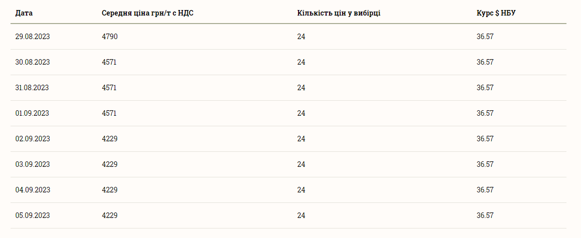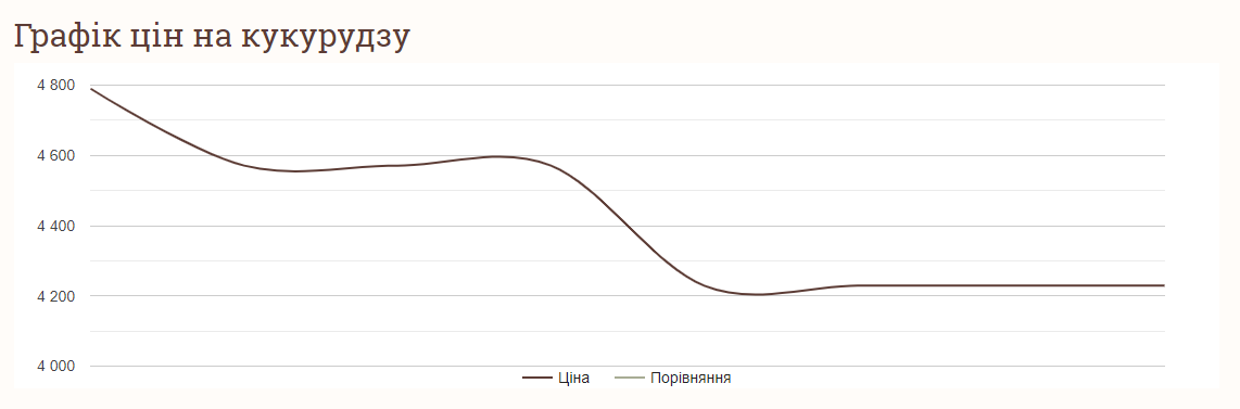 При цьому ціна на кукурудзу упродовж останніх днів сильно впала. Так, у вівторок, 29 серпня, середня вартість тонни кукурудзи становила 4790 грн і відтоді практично постійно падала до 4229 грн за тонну, що становить мінімум за тиждень. Він був зафіксований у суботу, 2 вересня, і тримається до тепер.