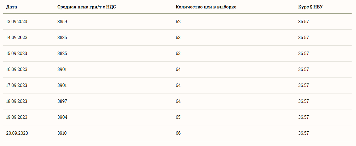 При цьому ціна на пшеницю упродовж останніх днів дещо зросла. Так, у середу, 13 вересня, середня вартість тонни пшениці становила 3859 грн і згодом впала спочатку до 3835 грн, а потім до 3825 грн за тонну, що становило мінімум за тиждень. Відтоді ціна практично постійно зростала і зараз є найбільшою за тижневий період.