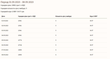 Станом на 9 вересня середня ціна на сою в Україні становить 13 890 грн за тонну разом з ПДВ.