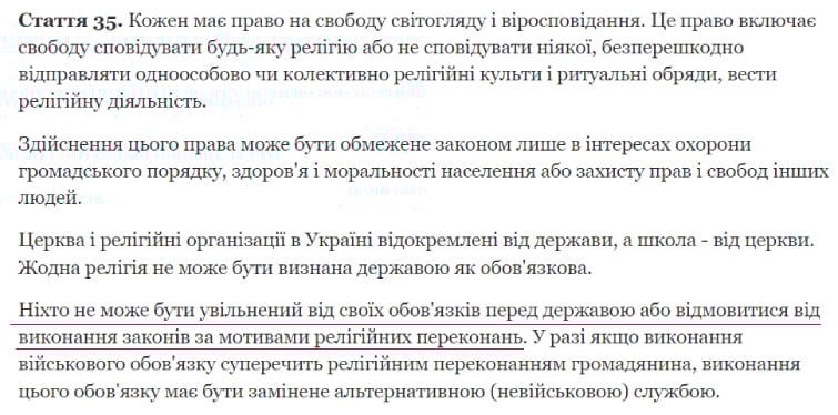 Стаття 35 Конституції України підкреслює, що жодна особа не може бути звільнена від своїх обов'язків перед державою на основі релігійних переконань.