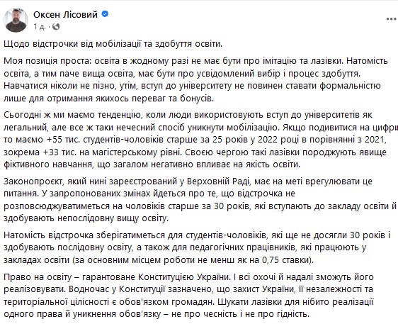 "Освіта в жодному разі не має бути про імітацію та лазівки. Натомість освіта, а тим паче вища освіта, має бути про усвідомлений вибір і процес здобуття. Навчатися ніколи не пізно, утім, вступ до університету не повинен ставати формальністю лише для отримання якихось переваг та бонусів. Право на освіту гарантоване Конституцією України. І всі охочі й надалі зможуть його реалізовувати. Водночас у Конституції зазначено, що захист України, її незалежності та територіальної цілісності є обов'язком громадян. Шукати лазівки для нібито реалізації одного права й уникнення обов’язку — не про чесність і не про гідність", — підкреслив міністр.