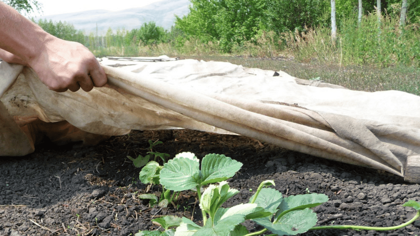 Такі матеріали, як лутрасил, спанбонд або інший агротекстиль не тільки захищають полуницю і ґрунт під нею від морозів, а й утворюють "повітряну подушку". А ще цей матеріал не злежується, не пріє і забезпечує пропускання повітря. Навесні він легко знімається і накидається, якщо це необхідно для провітрювання, і при заморозках.