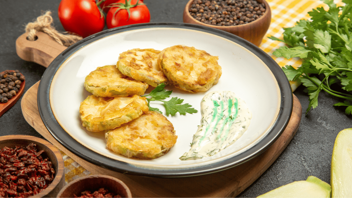 Для початку потрібно підготувати кабачки — помити, нарізати їх на кружальця, просушити на обваляти у паніровці з борошна, солі та спецій.