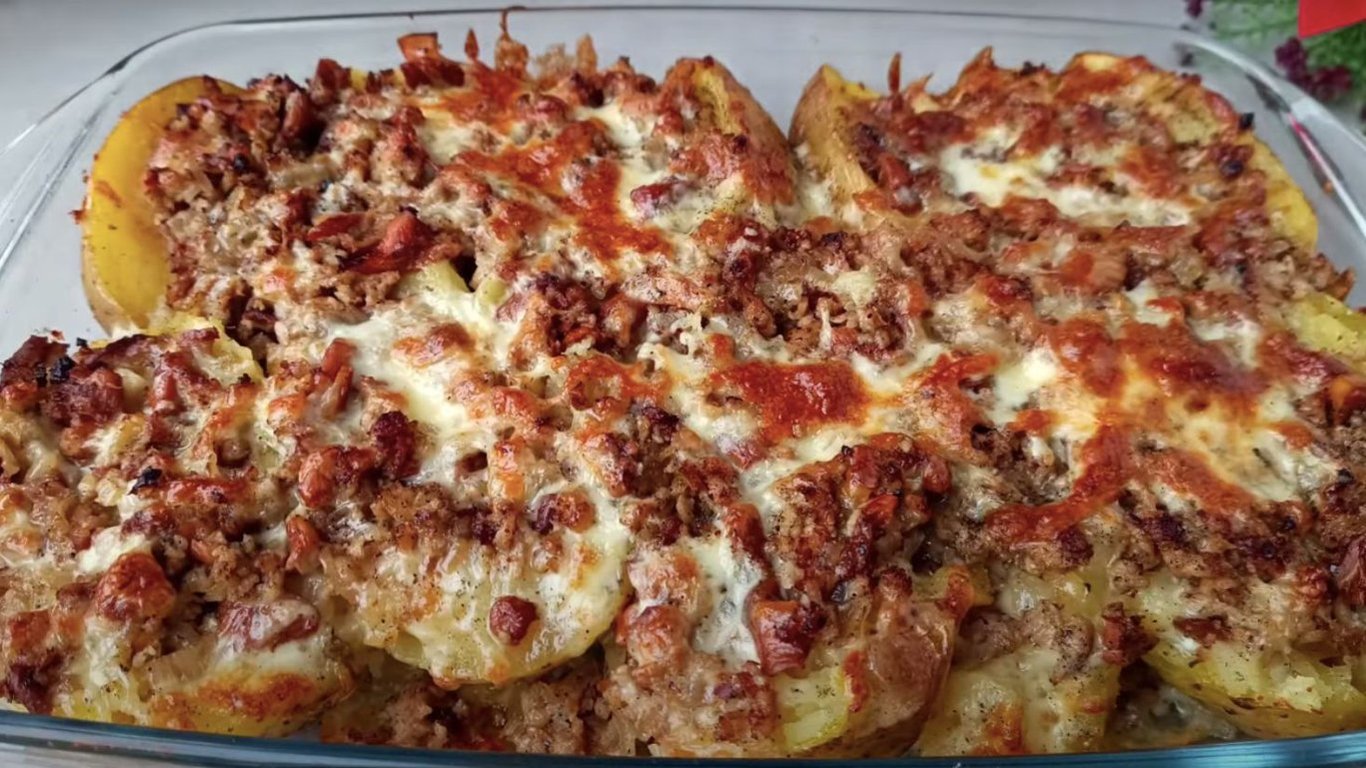 Ця запечена картопля з м’ясом, грибами та сиром — справжня знахідка для тих, хто хоче швидко приготувати ситну вечерю з мінімуму інгредієнтів. Усе просто: начинка, картопля, духовка — і страва готова.