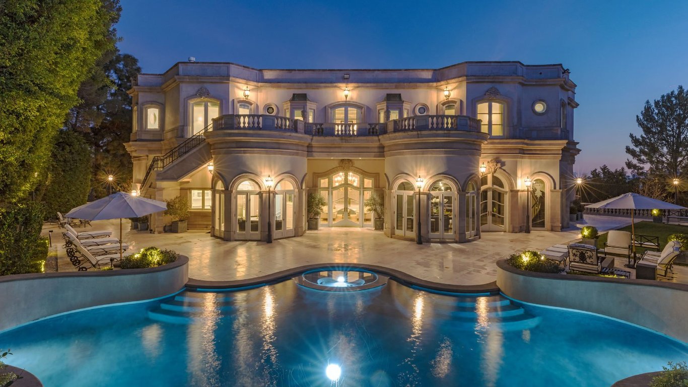 Роскошный дом имеет не менее роскошный земельный участок в 1,2 га с ландшафтным дизайном, домом для приема гостей, бассейном с зоной отдыха, теплицами, апартаментами для персонала, пятью гаражами и охраняемым помещением.