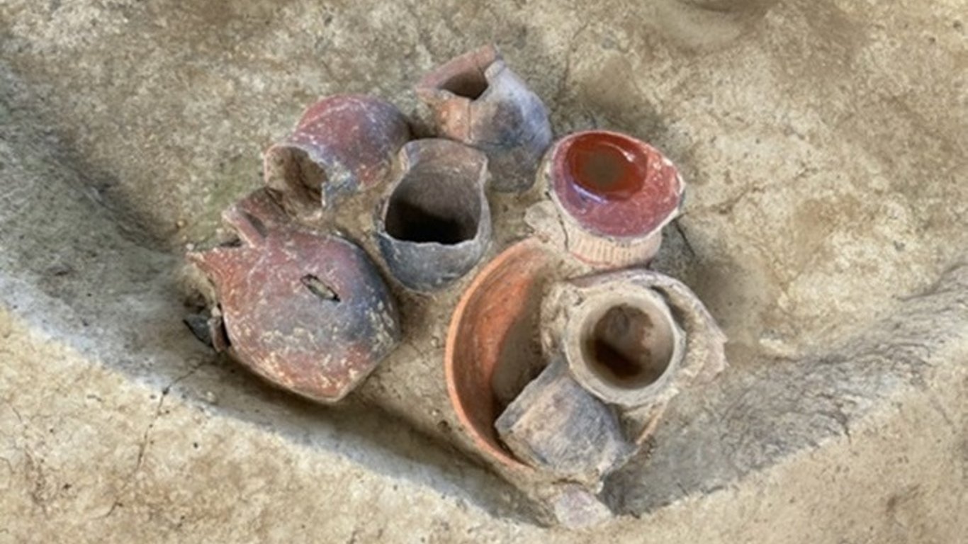 В насыпи также находились два человеческих скелета и высококачественные керамические сосуды, многие из которых оказались целыми. Сосуды были разной формы и размеров, некоторые - похожи на современные рюмки. Семь из 20 сосудов, в частности, имели тонкое горлышко.