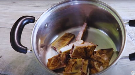 Сначала нужно 250 граммов копченых ребер залить водой и поставить на огонь. Можно использовать любое мясо, но из копченых ребер будет вкуснее всего, так как они отдадут свой копечный вкус.