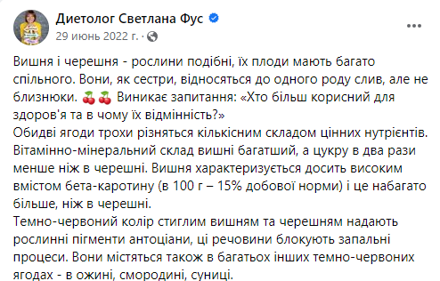 По словам Светланы Фус, витаминно-минеральный состав вишни богаче, а сахара вдвое меньше чем в черешне.