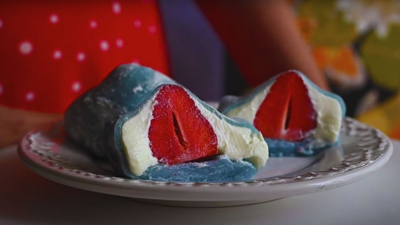 Высадить в центр крем, добавить клубнику и, защипнув края, сформировать моти.
