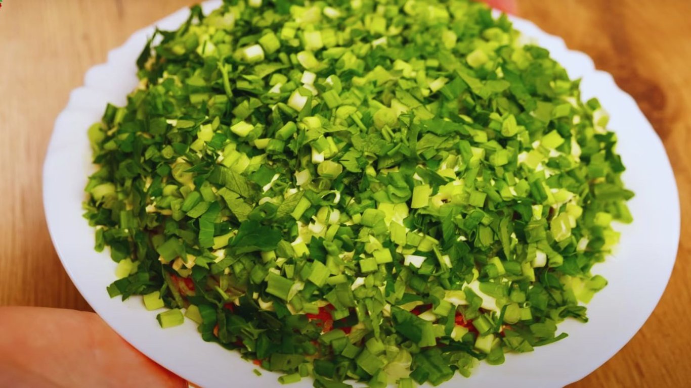 Измельчаем зеленый лук с петрушкой и кладем последним слоем.