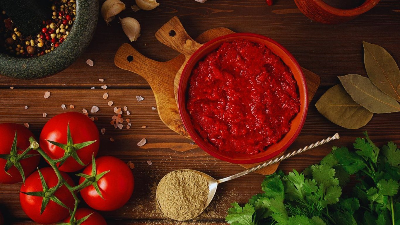 Пока томатная основа готовится, нужно сделать смесь из специй. Для этого необходимо смешать чайную ложку чабера, чайную ложку паприки, две чайные ложки хмели-сунели, одна чайная ложка кориандра, чайная ложка черного перца.